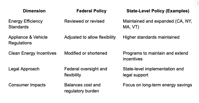 Federal policy emphasizes flexibility, market choice, and cost considerations, while many states, including California, New York, Massachusetts, Vermont, and several on the West Coast, have maintained strong energy efficiency and renewable energy programs. These multiple approaches influence electricity use, technology adoption, and investment decisions across the country, creating a diverse and evolving energy landscape.